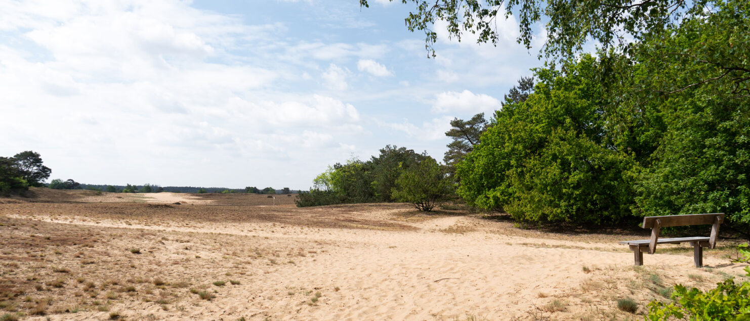 Na ongeveer 7 kilometer wandelen komen we bij een van de bekendste plekken op de Veluwe: het Kootwijkerzand – het grootste stuifzandgebied van West-Europa! Even voelen we ons alleen op de wereld – totdat uit het bos twee andere wandelaars opduiken. Als ze even later weer verdwenen zijn is het uitgestorven en stil. Onder de warme zon – het is ondertussen bijna middag – banen we ons een weg door het zand. Zelfs een bankje met een prachtig uitzicht over de zandverstuiving staat er verlaten bij. Achteraf gezien was dit de perfecte plek voor een lunchpauze geweest, want op de rest van het Boswachterspad Kootwijk komen we weinig bankjes tegen. We lopen een stukje langs de rand van het Kootwijkerzand, maar al snel neemt het pad ons weer mee het bos in.